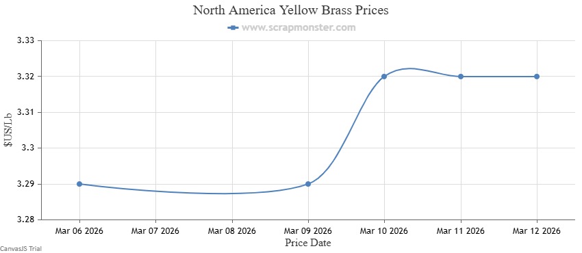 The price of Red Brass on the Scrap Monster Price Index recorded an increase of ↑0.87% as of Thursday, March 12, 2026. Yellow Brass prices also jumped higher by ↑0.91% on the Index.