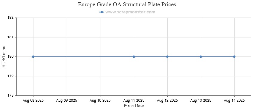 The price variation in Grade OA Structural Plate scrap over the one-week period from August 8 to 14, 2025 is provided in the below chart.