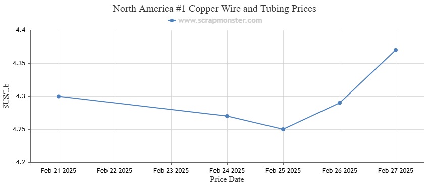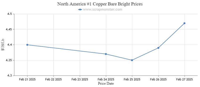 The price of #1 Copper Bare Bright on the ScrapMonster Index increased by 1.59% for the week, from $4.40 to $4.47 per pound, as of Thursday, February 27, 2025. Over the past week, the price of #1 Copper Wire and Tubing edged higher from $4.30 to $4.37 per pound. By the end of the week, #2 Copper Wire and Tubing was selling for $4.27 per pound, a slight increase of 1.67%.