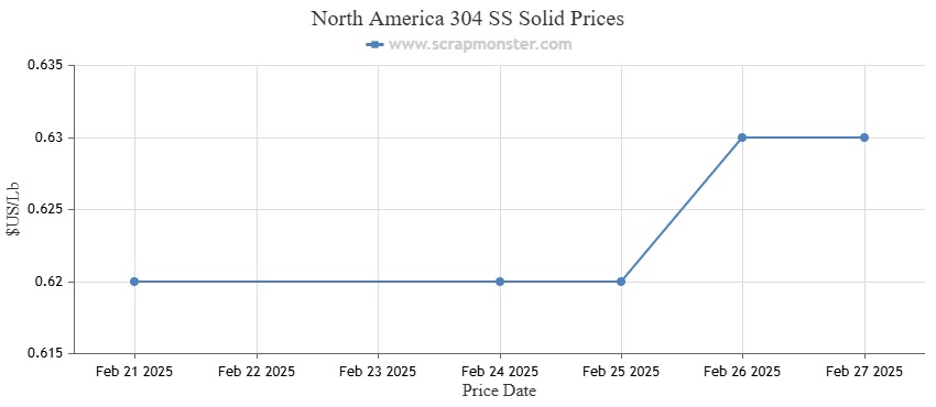 The price of 304 SS Solid were up marginally during the previous week, which concluded on February 27, 2025. The price of the commodity closed at $0.63 per pound.