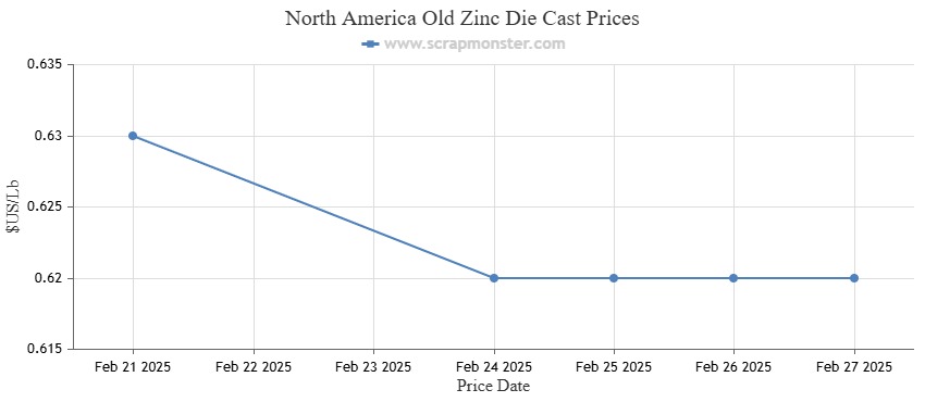 The price of New Zinc Die Cast fell from $0.75 per Lb at the start of the week to end at $0.74 per Lb. Week-on-week, Old Zinc Die Cast prices likewise witnessed marginal decline. As of Thursday, February 27, 2025, the closing price of the commodity dipped to $0.62 a pound.