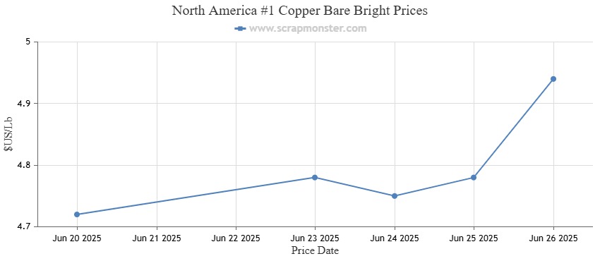 The price of #1 Copper Bare Bright on the ScrapMonster Index rose from $4.72 to $4.94 per pound as of Thursday, June 26, 2025, a weekly increase of 4.66%. #1 Copper Wire & Tubing went higher from $4.62 to $4.84 per pound, registering a jump by 4.76% from the prior week. By the end of the week, the price of #2 Copper Wire and Tubing had increased by 4.87% to $4.74 per pound.