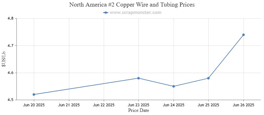 As of Thursday, June 26, 2025, the price of #1 Copper Bare Bright on the ScrapMonster Index was up 5.46% for the week, from $4.58 to $4.83 per pound. #1 Copper Wire & Tubing edged higher from the previous week’s closing price of $4.48 to $4.73 per pound. The average price of #2 Copper Wire and Tubing had increased by 5.71% to $4.63 per pound by the conclusion of the week.