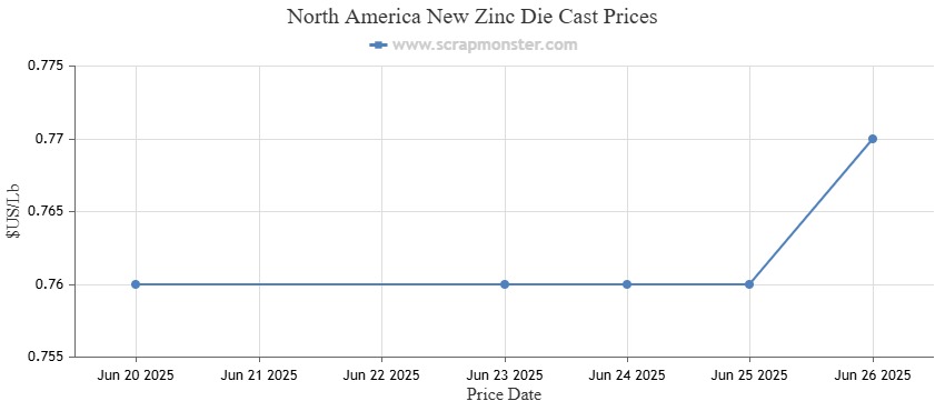 The price of New Zinc Die Cast were up by 1.32% over the previous week. Week-on-week, Old Zinc Die Cast prices likewise recorded increase by 1.56% on the Index. As of Thursday, June 26, 2025, the price of the commodity was $0.65 a pound.
