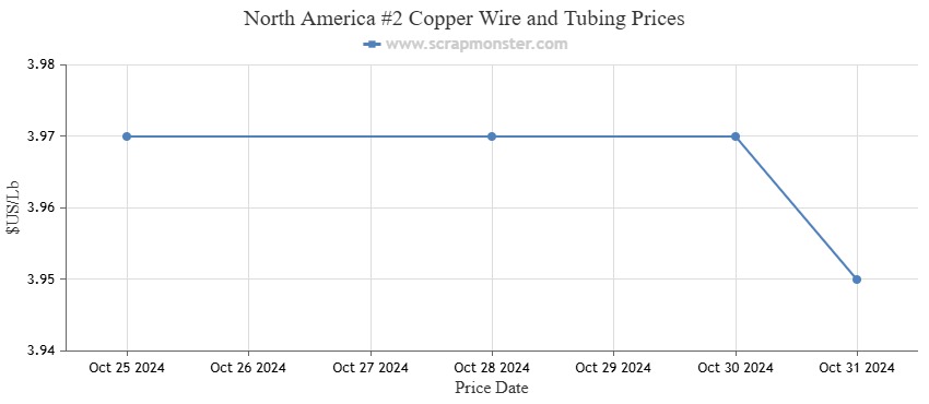 On Thursday, October 31, 2024, the price of #1 Copper Bare Bright on the ScrapMonster Index fell 0.48% week over week, from $4.17 to $4.15 per pound. The price of #1 Copper Wire and Tubing dropped from $4.07 to $4.05 per pound during the course of the week. By the conclusion of the week, the price of #2 Copper Wire and Tubing had dropped by 0.50% to $3.95 per pound.