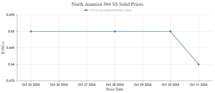 The price of 304 SS Solid decreased by 1.54% from $0.65 per pound the week before to $0.64 per pound for the week ending October 31, 2024.