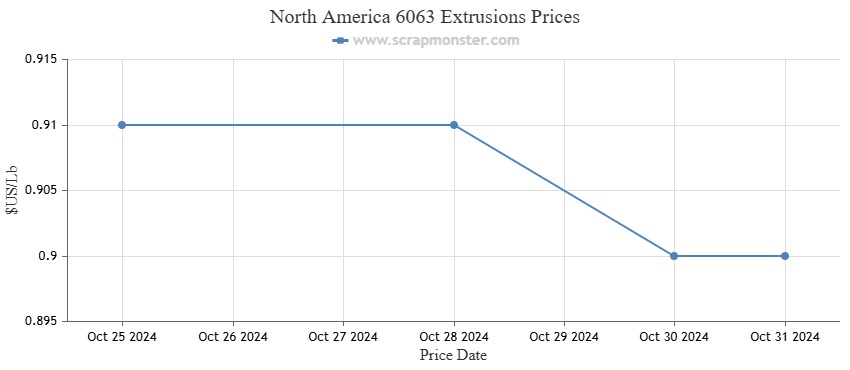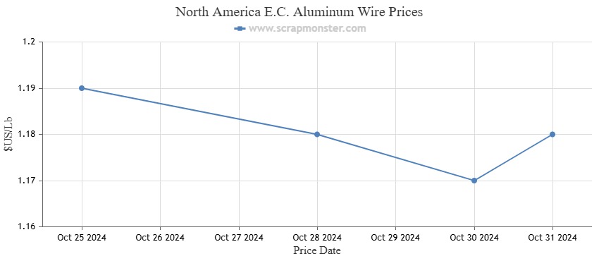 The price of E.C. aluminum wire was down 0.84% from the week before, indicating a downward trend. In comparison to the previous week's price of $0.91 per pound, the ScrapMonster Index indicated a slight drop in the price of 6063 Extrusions to $0.01 per pound. The Index's Old Cast prices changed by -1.27% during the week. Similarly, UBC's prices have dropped by 1.25% as of October 31, 2024.