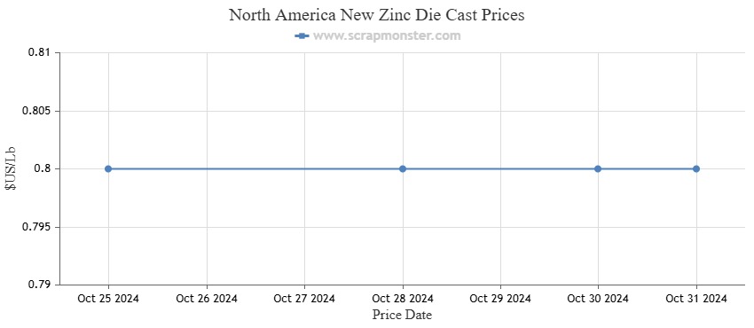 The price of New Zinc Die Cast remained constant at $0.80 per pound throughout the previous week. Over the course of the week, Old Zinc Die Cast prices remained constant as well. On Thursday, October 31, 2024, the commodity's closing price was $0.68 a pound.