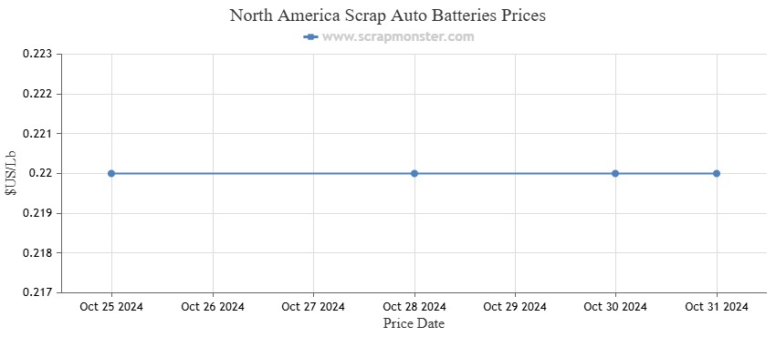 A review of the Scrap Auto Batteries price charts showed that the commodity's prices from the previous week had not changed. Throughout the week, the price per pound remained constant at $0.22.
