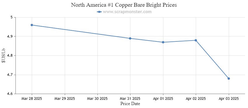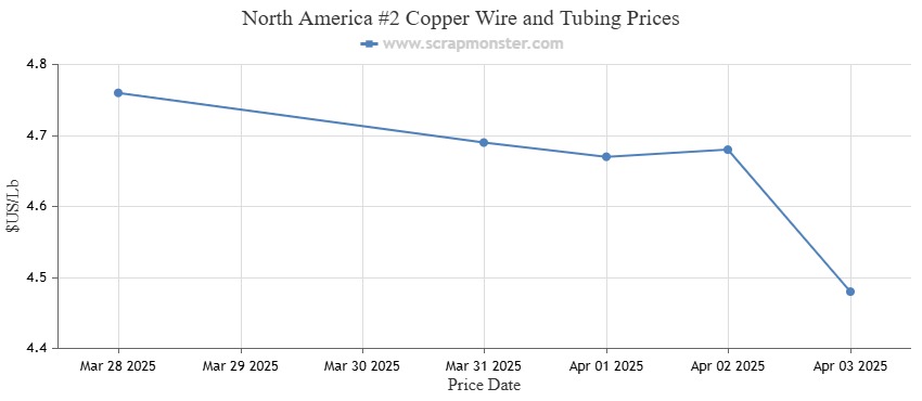As of Thursday, April 3, 2025, the price of #1 Copper Bare Bright on the ScrapMonster Index went lower by 5.65% through the week, from $4.96 to $4.68 per pound. The price of #1 Copper Wire and Tubing went down from $4.86 to $4.58 per pound during the previous week. By the conclusion of the week, the price of #2 Copper Wire and Tubing had recorded modest decline by 5.88% to $4.48 per pound.