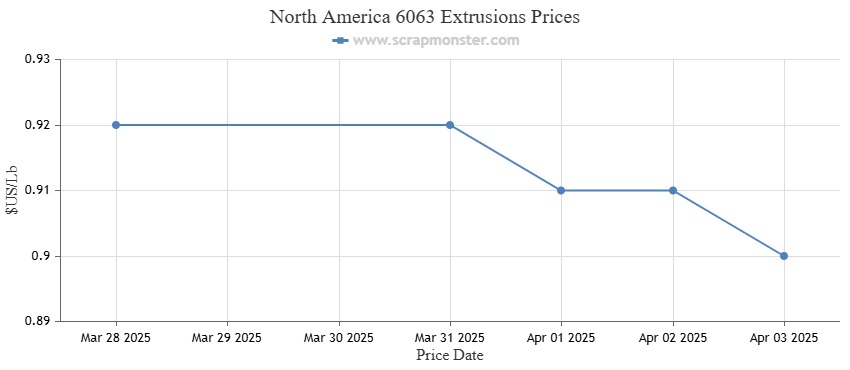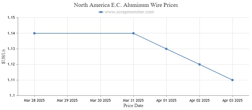 E.C. Aluminum Wire's price declined 2.63% to $1.11 per pound over the previous week. The ScrapMonster Index indicates that the price of 6063 Extrusions decreased by 2.17%. The prices of Old Cast in the Index decreased by 2.53 percent over the week. Additionally, UBC's pricing declined by 2.50% to $0.78 per pound as of April 3, 2025.