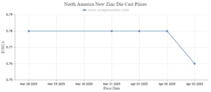 The price of New Zinc Die Cast were down by 2.56% to close the week at $0.76 per Lb. Week-on-week, Old Zinc Die Cast prices likewise witnessed fall on the Index. As of Thursday, April 3, 2025, the price of the commodity was $0.64 a pound, down from the previous week by 3.03%.