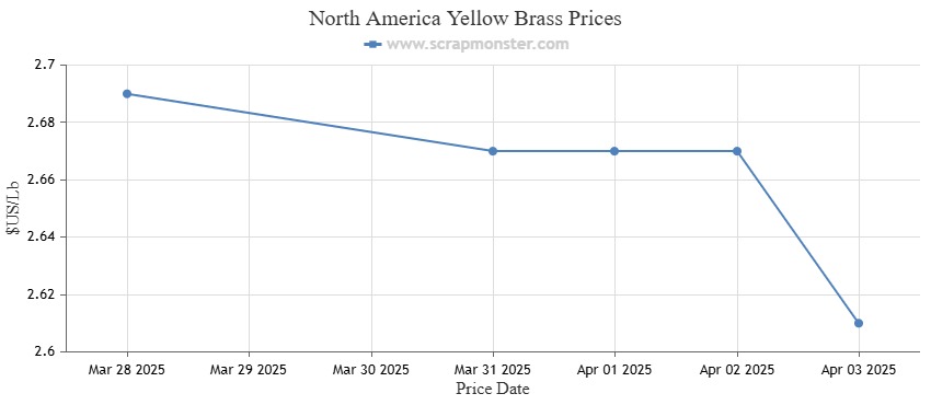 Over the previous week, Red Brass's price decreased by 2.82%. Toward the end of the week, Yellow Brass's price per pound also went lower from $2.69 to $2.61.