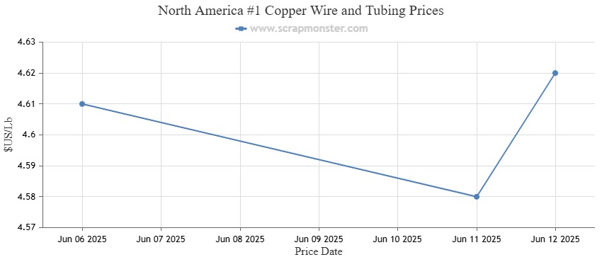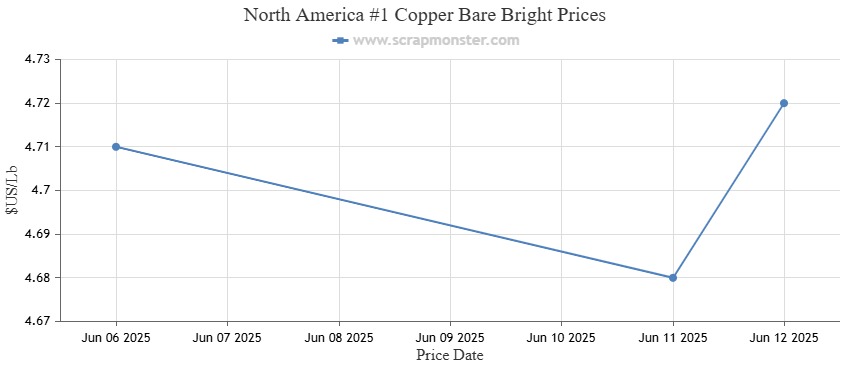 The price of #1 Copper Bare Bright on the ScrapMonster Index rose from $4.71 to $4.72 per pound as of Thursday, June 12, 2025, a weekly increase of 0.21%. #1 Copper Wire & Tubing went from $4.61 to $4.62 per pound, a slight rise from the prior week. By the end of the week, the price of #2 Copper Wire and Tubing had increased by 0.22% to $4.52 per pound.