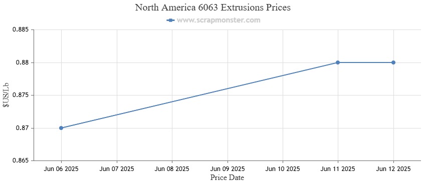The price of E.C. Aluminum Wire inched higher by 2.73% on the Index in comparison to the previous week. The price of 6063 Extrusions at the conclusion of the week ending June 12, 2025, was $0.88 per pound, rising by 1.15% week-on-week. The index showed a 1.37 percent jump in Old Cast prices. In addition, UBC's prices were up by 1.35% over the week prior.