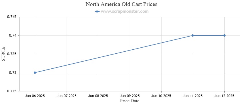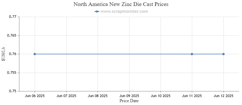 The price of New Zinc Die Cast stayed at $0.76 per pound. Additionally, the index indicated that the price of Old Zinc Die Cast remained constant from week to week. As of Thursday, June 12, 2025, the price of the commodity was $0.64 per pound.