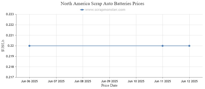 For the week ending June 12, 2025, the price of scrap auto batteries remained unchanged at $0.22 per pound.