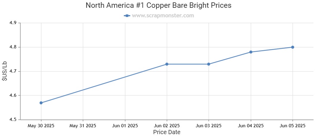 The price of #1 Copper Bare Bright on the ScrapMonster Index rose from $4.57 to $4.80 per pound as of Thursday, June 5, 2025, a weekly increase of 5.03%.
