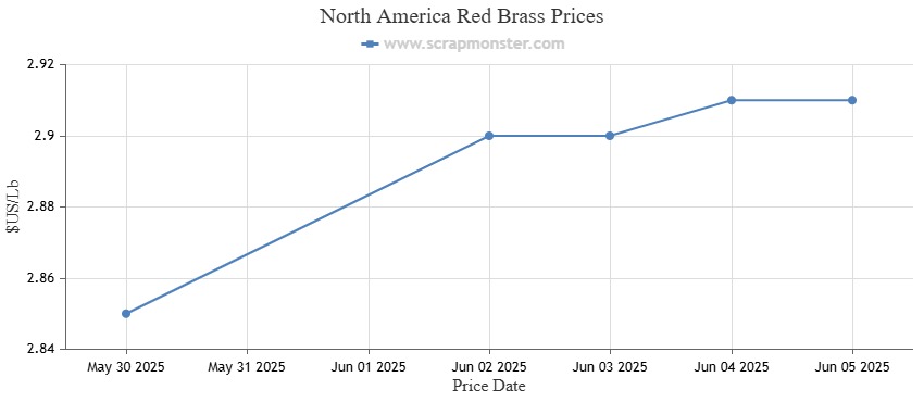 Red Brass was up notably by 5.61% from the previous week, trading at $3.01 a pound as of Thursday, June 5, 2025. Additionally, Yellow Brass's price per pound increased by 5.99% from the previous week.