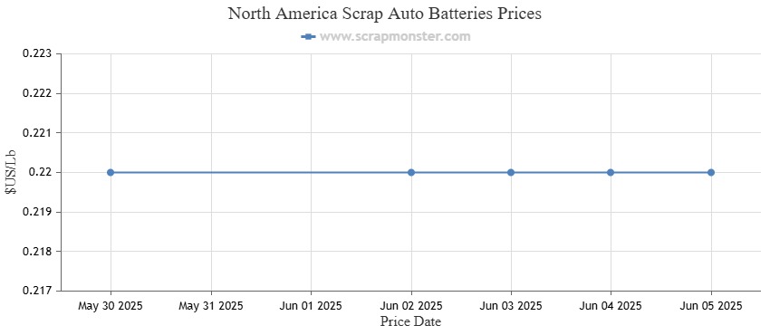 For the week ending June 5, 2025, the price of scrap auto batteries remained unchanged at $0.22 per pound.