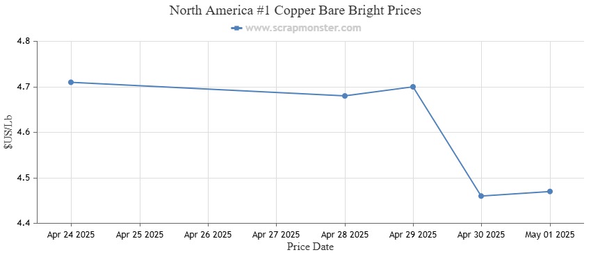 The price of #1 Copper Bare Bright on the ScrapMonster Index dropped 5.10% for the week, from $4.71 to $4.47 per pound, as of Thursday, May 1, 2025.