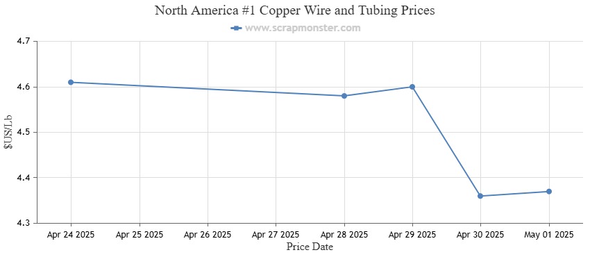 The price of #1 Copper Bare Bright on the ScrapMonster Index dropped 5.10% for the week, from $4.71 to $4.47 per pound, as of Thursday, May 1, 2025. Over the preceding week, the price of #1 Copper Wire & Tubing decreased somewhat, from $4.61 to $4.37 per pound. By the end of the week, #2 Copper Wire and Tubing was selling for $4.27 per pound, a little decrease of 5.32%.