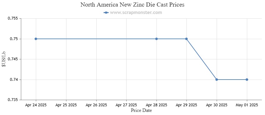 The price of New Zinc Die Cast were down by 1.33% to close the week at $0.74 per Lb. Week-on-week, Old Zinc Die Cast prices likewise witnessed decline on the Index. As of Thursday, May 1, 2025, the price of the commodity was $0.62 a pound, down from the previous week by 1.59%.