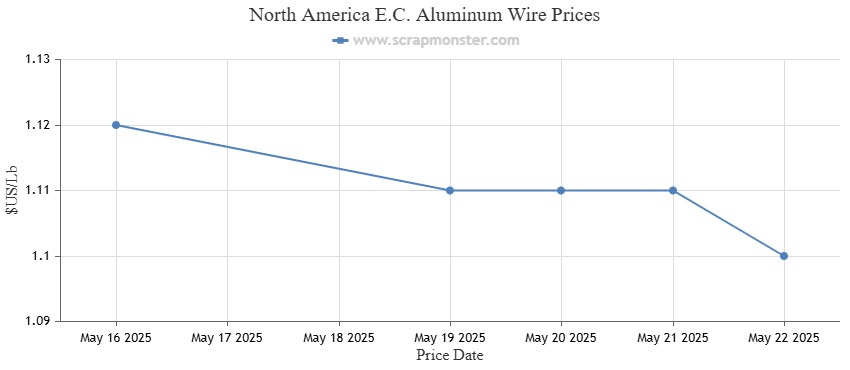 The price of E.C. Aluminum Wire has decreased by 1.79% since a week ago. Last week, the commodity's price closed at $1.10 per pound, down from $1.12 per pound the week before. In the meantime, 6063 Extrusions' price remained the same as it had the week before. According to the ScrapMonster Index, the prices of UBC and Old Cast were unchanged from the previous week.