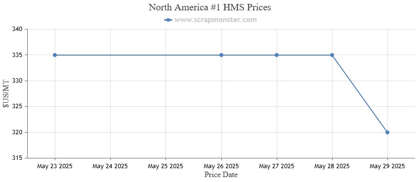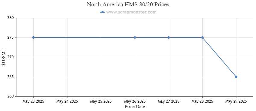 The prices of #1 HMS have fallen by 4.48% in the past week. Shredded Auto Scrap was flat during the week. The HMS 80/20 pricing for the Index registered a decline of 3.64%, falling from $275 per MT to $265 per MT. #1 Busheling prices dropped from $430 per MT to $420 per MT, down by 2.33% during the week ending May 29, 2025.