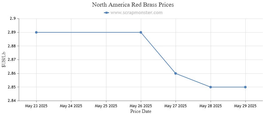 Red Brass was down 1.38% from the previous week, trading at $2.85 a pound as of Thursday, May 29, 2025. Additionally, Yellow Brass's price per pound decreased by 1.48% from the previous week.