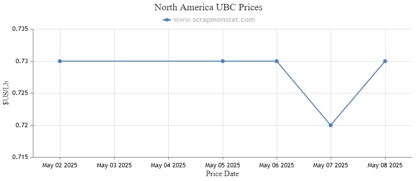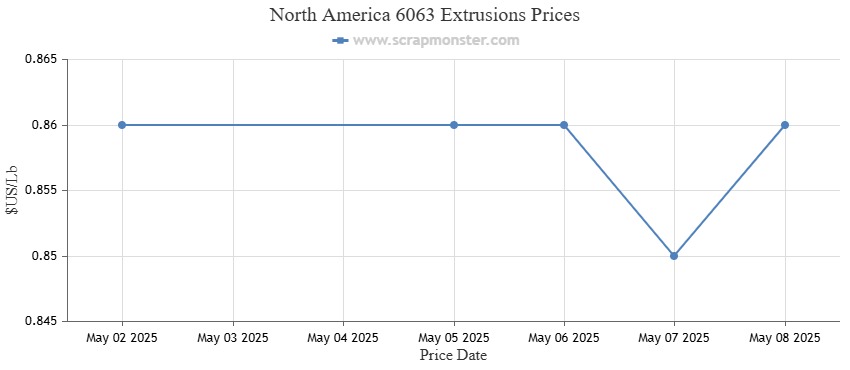 The price of E.C. Aluminum Wire reported a slight decline of 0.92%, falling from $1.09 per pound to $1.08 per pound. During the week ending May 8, 2025, the price of 6063 Extrusions was unchanged compared to the previous week. The Index showed that the price of Old Cast has remained stable. Additionally, UBC's prices held steady on the Index during the previous week.
