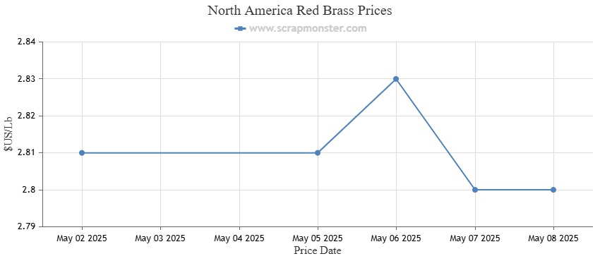 Red Brass was down 0.35% from the previous week, trading at $2.85 a pound as of Thursday, May 8, 2025. Additionally, Yellow Brass's price per pound decreased by 0.37% from the previous week.