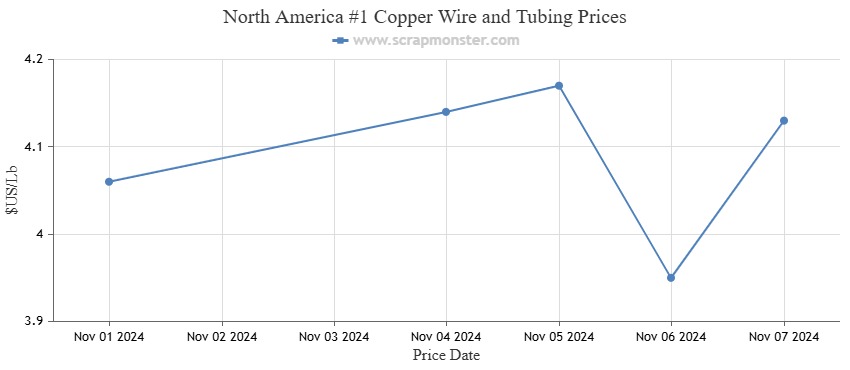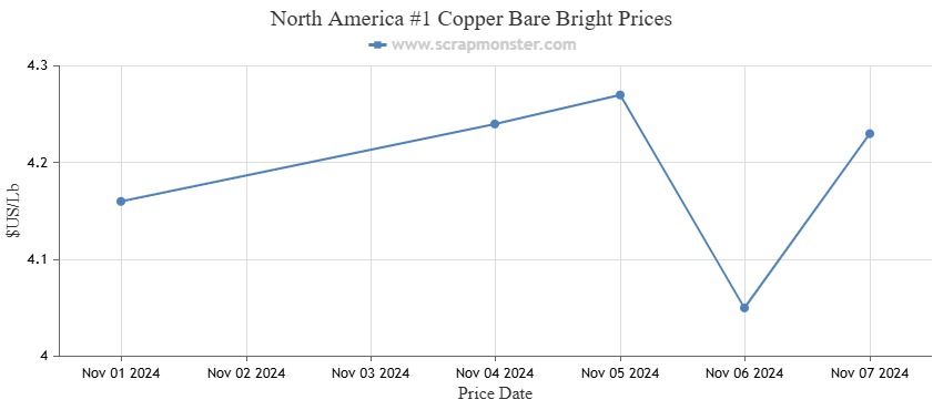 The price of #1 Copper Bare Bright on the ScrapMonster Index increased from $4.16 to $4.23 per pound on Thursday, November 7, 2024, a week-over-week increase of 1.68%. Over the course of the week, the price of #1 Copper Wire and Tubing went up from $4.06 to $4.13 per pound. The cost of #2 Copper Wire and Tubing increased by 1.77% to $4.03 per pound by the end of the week.