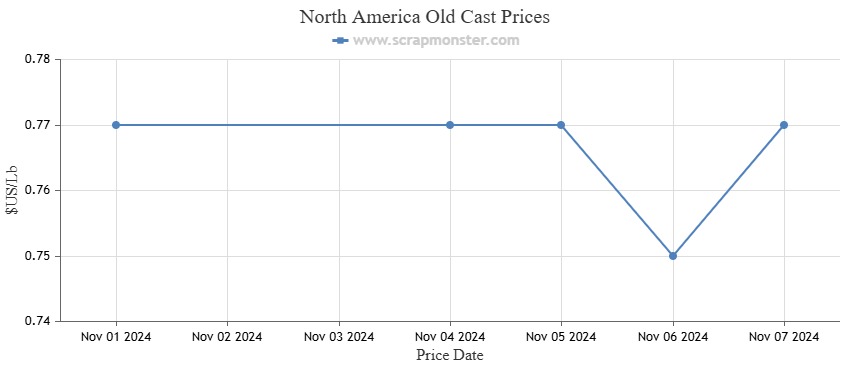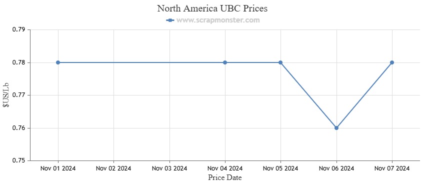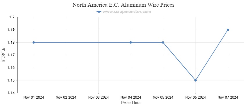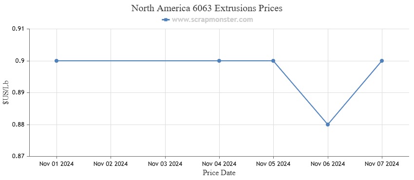E.C. aluminum wire's price was up 0.85% from the previous week, suggesting that it was on the rise. The ScrapMonster Index showed that the price of 6063 Extrusions had not changed from $0.90 per pound the week before. Over the course of the week, the Index's Old Cast prices remained stable. As of November 7, 2024, UBC's prices also showed no change.