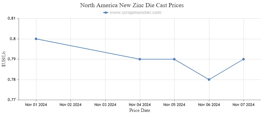 The price of New Zinc Die Cast decreased by 1.25% over the previous week, from $0.80 to $0.79 per pound. Week after week, Old Zinc Die Cast prices likewise decreased. As of Thursday, November 7, 2024, the closing price of the commodity was $0.67 a pound.