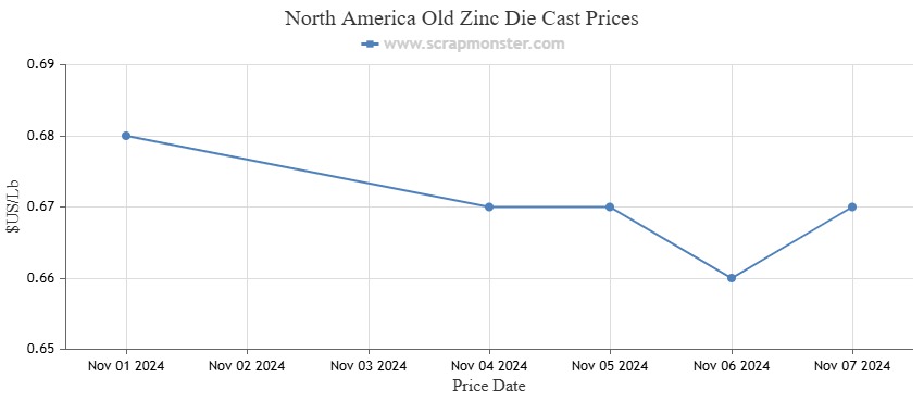 Over the preceding week, the price of New Zinc Die Cast dropped by 1.25 percent. By the conclusion of the week, the price of Old Zinc Die Cast had dropped by 1.47% to $0.67 per pound.