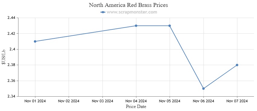 As of Thursday, November 7, 2024, Red Brass was trading at $2.42 a pound, 1.22% less than the price the week before. Furthermore, Yellow Brass's price per pound decreased by 1.30% during the previous week.