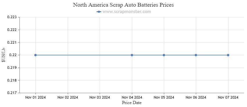 Examining the pricing charts for scrap auto batteries, it is revealed that there had been no change in the commodity's prices from the previous week. The price per pound stayed steady at $0.22 for the entire week.