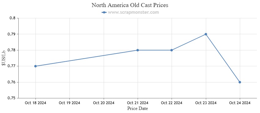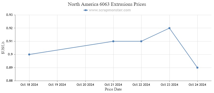 E.C. Aluminum Wire prices showed a rising trend, rising by 0.88% from the previous week. The ScrapMonster Index showed a minor decrease in the price of 6063 Extrusions of $0.01 per pound as compared to the previous week's price of $0.90 per pound. Weekly changes in Old Cast prices on the Index were -1.28%. As of October 24, 2024, UBC's prices have similarly decreased by 1.27%.