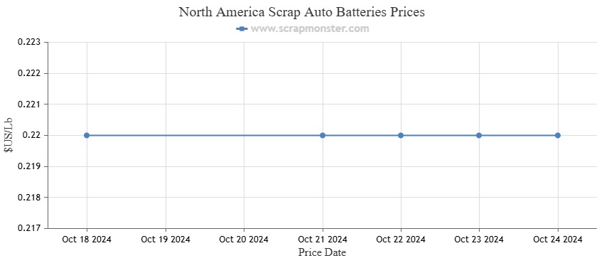 A review of the price charts for Scrap Auto Batteries revealed that there had been no change in the commodity's prices from the previous week. The price per pound stayed the same at $0.22 throughout the week.