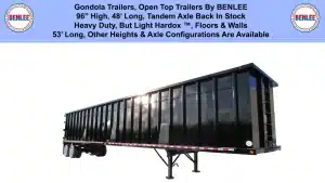 Gondola trailers, open top trailers by BENLEE. 96” high and 48’ long, tandem axle are back in stock. Heavy duty, but light Hardox™ floors and walls. 53’ long, other heights and other axle configurations are available.